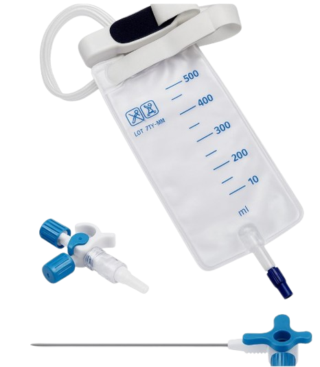 Bolsa de drenaje ambulatoria de 800 ml, portátil y segura. Incluye válvula de descarte, tubo con conector luer lock, llave de 3 vías y sistema de fijación con velcro tipo muslera.