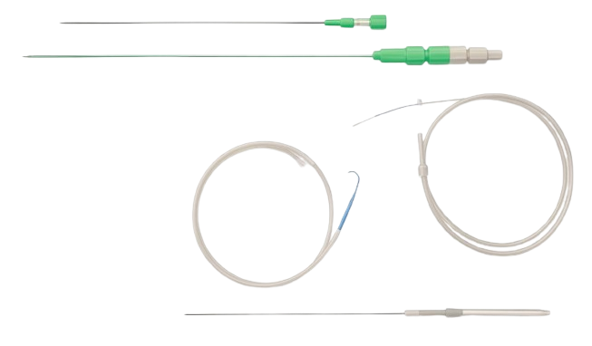 El producto incluye una aguja introductora de 21G, un sistema triaxial 6Fr x 18 cm con marca X-Ray para mayor control radiológico, además de una guía hidrofílica de 0.018″ y una guía teflonada de 0.035″, elementos que garantizan exactitud y un desempeño confiable.